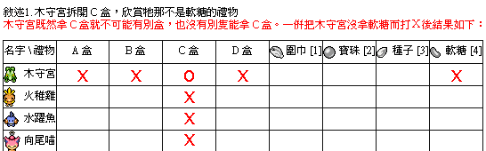 提示一:條件都不重複。舉例像木守宮拿到C 盒(在那格填O做記號),其他隻當然就不可能是 C 盒(都打X),其他依此類推 提示一二:先想想敘述2.中到底是誰拿到了 B 盒種子呢?哈~哈哈哈! ←左邊可用游標拖移來做記號(有就填O,沒有就填X)。無法拖移的話可自行印出作答 |