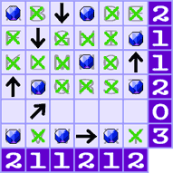 左圖:由於規定「每個箭頭各指向一顆不重複的鑽石」,所以兩個箭頭的交會處就一定沒鑽石的啦!於是先把E和Q打叉,那就立刻知道J有鑽石。把J的橫列和周圍全打叉後,又可知N有鑽石。把周圍的打叉,又N所在的直行恰有兩顆,所以知道C也有鑽石!