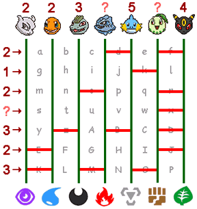 一開始先無視一切問號,先觀察神奇寶貝頭上的數字和距離所對應的屬系標示有多遠。像超夢的屬系在正下方但卻需要兩條橫槓,那表示兩條都得在同一直行處等等。此外像是注意超夢的橫槓絕對不能比小火龍高,不然小火龍就回不了家之類的觀察力也是必要的啦,哈~哈哈哈!