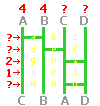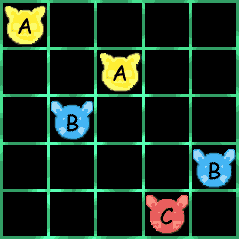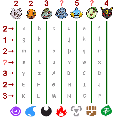 就是要你反推理出橫槓們的位置啦!先試試以下例題來找出破關訣竅吧: 直線上方的數字是「從起點到終點會經過幾個橫槓」,而箭頭旁的數字則是「該橫列有幾個橫槓」 問號則是請你自行判斷。而紅色的橫槓你可以自行拖動到例題上 注意因為梯子籤的規則是遇到橫槓就要橫走,所以不能出現相鄰的橫槓 (像底下例題的 b 處不能有橫槓,不然B一下去就不知道該往左還往右囉) 那麼自己動手解解看(答案在本網頁某處),說不定你會解出心得,就靠這訣竅破關吧! (例題→) ![]() ![]() ![]() ![]() ![]() ![]() ![]() ![]() ![]() 對了,底下七隻寶可夢正好都得到屬於牠們屬系的禮物標示,請你反推出橫槓們的位置吧 什麼?你不知道哪隻是哪種屬系?看名字就會瞭吧,哈~哈哈哈! |