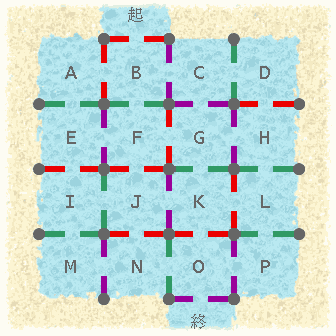 哈哈哈!果然夠瞭解我……喂!等等!惡趣味是什麼意思!? 算啦,總之這次的比賽不止考驗選手的體力,也要試試選手們的腦力: 從這關的起點開始,必須要依照「紅→綠→紫」的閘門順序前進才能順利到達終點 要是順序弄錯的話可是會翻船的喔,哈~哈哈哈! *拍拍們乘坐的「暴鯉龍舟」可拖移到圖中以幫助思考,若無法移動請用繪圖軟體或列印作答 |
