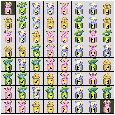 哈~哈哈哈!附近的廣場正好在舉辦祭典活動,所以我就帶我這兩隻小傢伙過來玩玩囉。 這套圈圈有個特別的規則:從左上角開始套,而下一個要套的必須和前一個緊鄰(上下左右,不能斜) 並且是同數字或同寶可夢的擺飾,依此類推套到右下角為止。看你能不能比負電拍拍還早過關啊? |