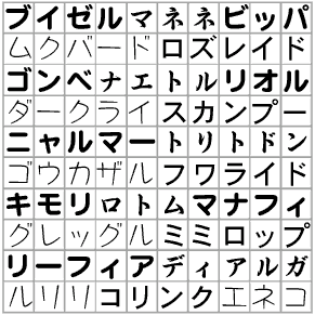 可以先從只出現一次的字,例如「ニャルマー」的「ニ、ャ」開始拼起,就可以立即對照上下方的名字來判別是哪隻神奇寶貝了。由於名單中的名字重複性不高,很快就能完成啦!(右下圖以不同字體凸顯各個名字)