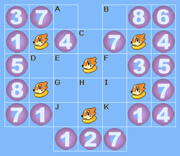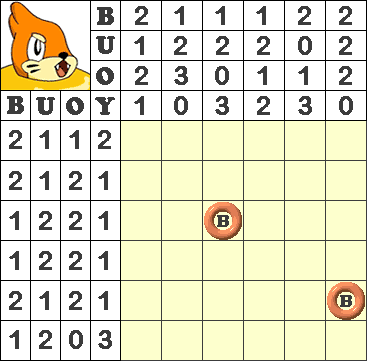我就說這麼搗蛋會被老師震撼教育嘛...現在阿噗和阿麥被抓去整理鐵櫃裡4種款式的泳圈 數字代表該直行或該橫列會有的泳圈款式數量,但為了排起來美觀,規定「相同的款式不能四邊緊鄰」 你也來幫忙剛開學就被處罰的可憐小鬼們過關吧,哈~哈哈哈! |
