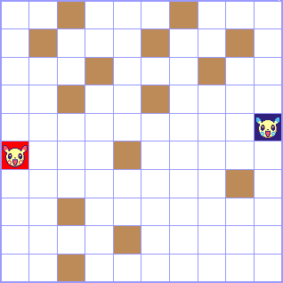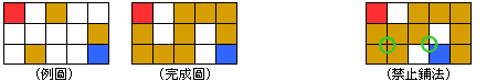 那你們就來幫我把這些木板鋪好來防滑吧,阿噗你去站在紅色格,阿麥去藍色格 你們中間已經有幾片木板我鋪好了,現在的任務是要鋪接成一條長蛇狀的木板路(不能斜著鋪), 但是這條「木板長蛇」不可以碰觸到自己,連對角線也不行。(看禁止鋪法的綠圈處) 所以像例圖的鋪法必須要像完成圖這樣才不會碰觸到自己。 ![]() 對了,只剩下29片木板給你們鋪,要完全用光,但也不能搞到不夠鋪喔,哈~哈哈哈! |