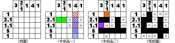 例圖這是我之前考她的題目,一起來解解看上次我們的見面地點在幾號道路吧 首先看直行的4,就算從最上面塗下來(紅斜線),或從最下面塗上來(藍底處),中間都有3格會塗到, 所以那3格就肯定要塗黑了。再來看橫列的「2.1」和「1.1」,因為要隔開來,所以我們在該列的黑格旁邊打X, 就可以知道綠底處也要塗黑,變成半成品一的樣子了。 再來橫列的「5」當然代表該列全塗黑,這時由於直行「3」不能間斷,所以紫底處一定要塗黑。 繼續把隔開的部分打X,就知道橘底處也要塗黑,成為半成品二的樣子。 最後把剩下的地方塗完,就看得出一個手寫的4,所以我們之前見面的地點就是在 4 號道路啦~ ![]() |