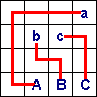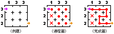 請看底下的例題:我們可以將「確定會經過的隔間」用一個紅點表示 而當某排的紅點數抵達了該排數字規定的界限,那代表該排剩下的隔間都不能通過,打X(見過程圖) 最後再把紅點從入口到出口連結起來,不要交叉路徑或迴轉,就是完成圖了! ![]() |
