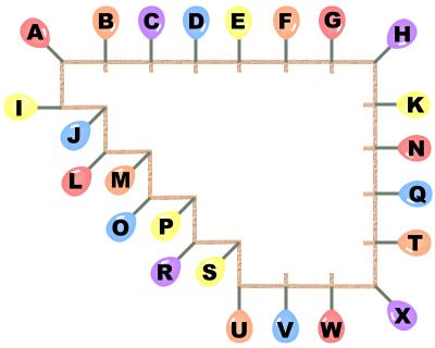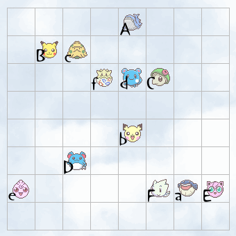 嘿,別真的把氦氣吸進去啊! 原來綁氣球用的線斷掉了,這些氣球才會在空中亂飄的 原本是把進化前後(同字母的大小寫)的兩隻寶可夢用線綁在一起 每格都恰好有一條線通過,線不會重疊,也不會有格子沒有線經過,就像下圖這樣: