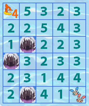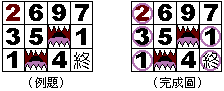 在例題中,從起點開始可以往右或往下 2 格。但是一往右就會踏到 9 ,下一步就會游出界所以不行 那只能往下 2 格到「1」。再來可以往上或往右 1 格,但往右就會被吞,所以只能往上 1 格到「3」 最後再往右 3 格到「1」,並往下 1 格就可以到終點啦(見完成圖),哈~哈哈哈! ![]() |