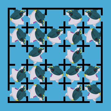 Bui…(吞口水),要前往岸上得先游過這海域中最可怕的「巨牙鯊迷宮」啦。迷宮外圍有四個開口, 我們得選其中一個開口進去,最後從另一個開口出來。而每個隔間(共25個)要剛好游過一次才行 但是要進入有巨牙鯊的隔間時,千萬不能朝正對鯊口的方向進去,否則就會……Bui!(狂抖) 你來想想看該從哪個開口進去,怎麼游過這25個隔間,最後安全的從哪個開口出來吧。 |