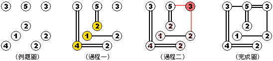 利用底下的例題介紹幾個技巧吧! 基本技巧是看到角落的「4」,由於只有兩種方向可以架,就馬上知道要往北和往東各架兩座橋 技巧二是把只有一種可能架法的島優先架好,如過程一中黃色的「1」和「2」。記得把額滿的數字叉掉 技巧三是像過程二的紅色「3」那樣,由於每方向最多只能兩座橋,所以僅存的兩方向至少都要一座橋 利用這些技巧,並判斷剩下還沒搭到的橋,就可以達到完成圖那樣的結果啦,哈~哈哈哈! ![]() |