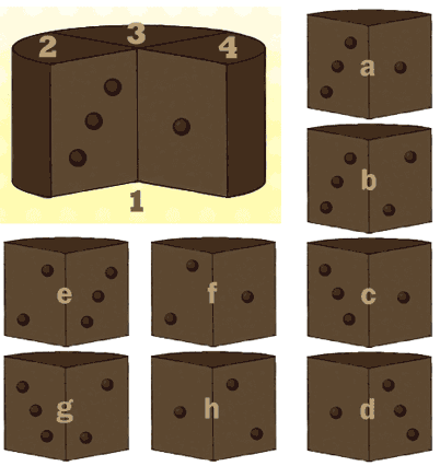 咦,桌上有一個蛋糕和一張卡片寫著:「親愛的鐵老頭爸爸節快樂A_A……」 沒想到這兩個小搗蛋鬼還這麼有心,送我父親節蛋糕啊,不過居然得解開謎題才能吃,傷腦筋呢 底下這被切成四塊的巧克力蛋糕,每個切面都跟相連的另一面相同 現在被他們拿掉其中一塊後,變成下圖的模樣 聰明的你能幫我想出底下的三塊蛋糕跟被拿掉的一塊各應該長什麼樣子嗎?哈~哈哈哈! |