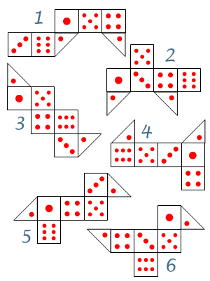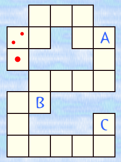 總算把第二關那個點數順序完全錯亂的偽骰子組好啦,哈~哈哈哈! 沒想到兩個小傢伙還要我用第二關的偽骰子過下這關,父親節禮物還真不好拿啊… 第二關的偽骰子必須沿著底下的格子圖走完一遍,而且只能用「翻轉」的方式前進 底下已經先走了第一步和第二步,第一步時「一點」朝上,第二步時「二點」朝上 那麼A、B、C這三格各是哪一點數朝上呢? (只論點數,不論該點所朝的方向) |
