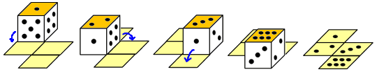 讓我來分享一下剛剛研究出的一點心得吧! 下圖中使用了別的骰子舉例,注意跟第二關的偽骰子不一樣喔 起初骰子的「一點」朝上,再來往前翻轉走到下一格變成「二點」朝上 接著往右翻轉變成「三點」朝上,最後往畫面前方翻轉變成「六點」朝上 於是我們就可以在格子上依序放上「一點、二點、三點、六點」的記號了。那你加油吧! |