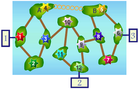 從入口1開始照星形數字的順序走,把A和B之間搭起橋來,就可以順利走到出口2囉