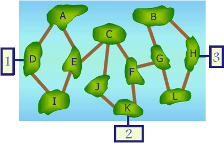 這裡是花園的小溪,溪上有十二個造景島,中間有木橋相連,周圍有三個出口 光這樣還沒辦法一次走完所有的島,但「只要再搭一座橋,就能不重複的一次走完十二個島」喔! 有些橋可能不會走到,而多搭的這座橋只能搭在相鄰的兩座島間 (中間有其他島擋住的話不能繞過去,也不能跨越其他橋) 那麼,要從哪個入口進去、哪個出口出來、在哪兩個間搭一座橋,以及怎樣走完呢?哈~哈哈哈! |