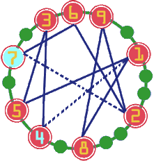 如果稍微用心一點畫出數字與數字間的直線關係,會得到左下圖的關係圖,就可知最大的九位數會是 762981534