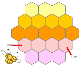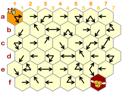 唉呀,三蜜蜂小妹為了採蜂蜜,一不小心被困住這個天然的蜂窩迷宮中了 請你跟著起點的阿噗阿麥(a1),一步一步順著箭頭走到終點(f6)拯救她吧,哈~哈哈哈! (譬如從 a1 開始、下一步可以走 a2 或是 b1 由你判斷,依此類推) |