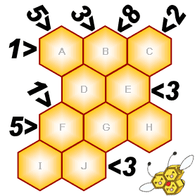 哎呀,講話太台了吧!原來三蜜蜂小妹剛剛是想求助儲藏蜂蜜,才會找到迷路的啊…… 這蜂窩有十格,其中有兩格需存1份蜂蜜、有兩格需存2份、有兩格存3份,還有四格不存放蜂蜜 而數字代表該箭頭所示直線方向的蜂蜜份數總和。(舉例:A+B+C=1,C+E+G+J=2) 那請你幫忙三蜜蜂小妹,儲藏正確數量的蜂蜜滿足條件吧,哈~哈哈哈! |