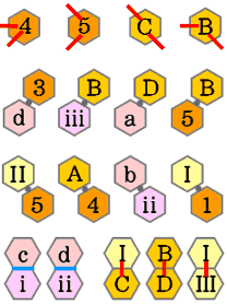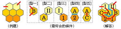 哎呀!既然自稱救難隊那當然就要幫忙到底了,怎麼變成要討酬勞還要約出去呢? 任務的目的有二個,「決定各格的編號」及「決定紅色路線和藍色牆壁,讓每一格都恰通過一次」 而在規劃編號和路線時,需要滿足三蜜蜂指定的條件(可以當成規劃用的提示) 現在就來介紹編號方式和條件類型吧: ●編號方式是第一橫列用大寫羅馬數字(I、II、III),第二橫列用大寫ABC,第三橫列用數字, 有第四橫列的話就用小寫abc,第五橫列就用小寫羅馬數字(i、ii、iii)。 ●條件類型有五種,型一是「某格的紅色路線方向」,型二是「某兩格是在同一條左下直線」 型三是「同一條右下直線」,型四是「兩格緊鄰但被藍色牆壁分隔」,型五是「兩格緊鄰並相通」。 ![]() 看上面的例題解答,是不是「需符合的條件」都有滿足到呢?注意條件中的符號位置需要你判斷喔 你可以利用底下所附的小數字來標示「哪些格不能是哪些符號」,就會比較輕鬆啦,哈~哈哈哈! |