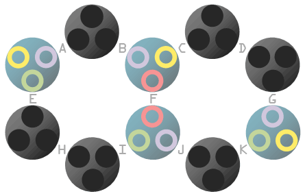 首先把右側的四顆藍色蛋白質球體放入底下指定的位置,但可以看情形旋轉 接下來再想辦法把六顆黑色球體放入空位,「讓同色的兩個胺基酸圓環對著同一字母」 旋轉方式是快速點兩下(會呈順時針旋轉),Safari使用者請改用Firefox才能旋轉 ![]() |