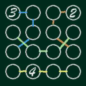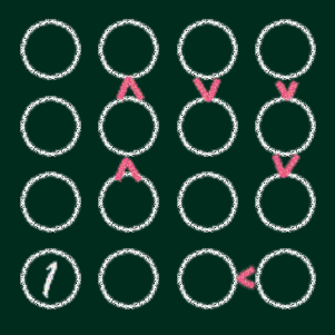 益智口袋照慣例是要連闖三關的嘛!也難怪鬼斯不放人了 這次鬼斯用黃粉筆把陣式分成四區,規定每直行、橫列、和每區中的數字都要有1到4不重複 最後要像連連看一樣,從「白1」當起點,照1→2→3→4→1→2→3→4…的順序走到終點的「白4」 只能上下左右走,每格都要不重複的走過。最後一定要排成這樣才算過關喔,哈~哈哈哈! |