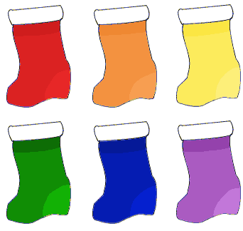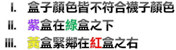 喂喂,在說什麼啦!? ......只要照著底下三個提示,答出每隻聖誕襪裡各放了哪個顏色的禮物盒,就算成功過關囉! |