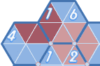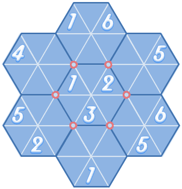 哈~哈哈哈!要享受雪花糕之前必須要解開有趣的「雪花數獨」才行喔! .雪花糕中有 13 個六角形,而每個六角形都要1~6各出現一次 (7個被藍框圍著,而剩下6個的中心有圓點;右圖粉紅是其中之一) .外圍有六處「缺口」,各處缺口的四個數字不重複 (缺口是由四個三角形形成,見右圖深紅處) 條件只有以上兩個,那請加油完成雪花數獨拿聖誕獎品吧!哈~哈哈哈! |