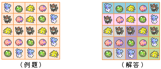 哎呀,不要這麼說嘛!幸好上個月有你們泳氣鼬老師幫忙,這個月才有得出爐的嘛……… 我們從伊修地方(暫)收服了新的寶可夢,要來送給五位訓練家們當聖誕禮物,你來幫忙平分吧! 分配規則很簡單:「分成五區,每區中讓五隻寶可夢相鄰而不分斷」 看底下例題和解答應該就很明白吧?那你們加油吧,哈~哈哈哈! ![]() |
