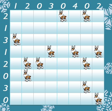 花鹿準備好了,你們和朋友們一起到紫堇市各處幫忙發送禮物吧!不過要先過這關的挑戰才行: 1.每隻聖誕帽拍拍都要緊鄰一隻花鹿(緊鄰=上下左右) 2.任兩隻拍拍們不能四邊相鄰,也不能對角相鄰 3.數字代表該行或該列有幾隻拍拍 你可以把0的行列空格全部放上叉叉做記號,那那你加油吧,哈哈哈哈! |