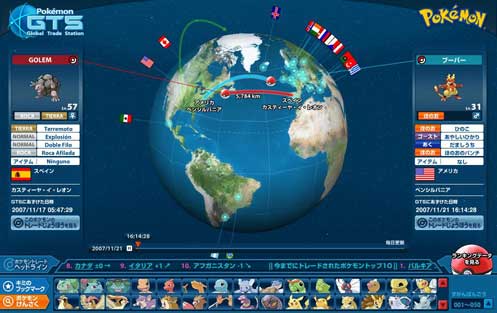 觀看在某個時間點上哪兩地互相交換了哪兩隻寶可夢。在上圖中我們可以看到2007年11月21日的下午,一隻在西班牙的隆隆岩跟一隻在美國的鴨嘴火龍互相交換了。牠們各旅行了5764公里!
