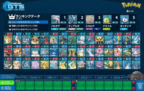 按下右側的寶貝球,就進入各種排行榜模式。你可以看到最常被交換的寶可夢TOP 50(前50名)、最常被徵求的寶可夢TOP 50、以及最常被寄放的寶可夢TOP 50。