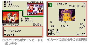 在這款遊戲中登場卡片種類是以已經在日本市場上出現的紙牌卡片為藍本,大約有220多種。 真正的紙牌卡片遊戲需要兩個人玩,但在這款遊戲中即使是一個人也能夠享受寶可夢卡片遊戲的魅力。看看右圖的皮卡丘牌面樣式,就是真正紙牌卡片的重現版呢! | ![]() |
