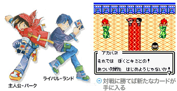 玩家還可以和朋友藉由GB連接線來場精彩的對戰,或是可以藉由紅外線通訊功能來互相交換卡片。 更有趣的是底下的「卡片對對碰」,藉由紅外線「相撞」來撞出新的卡片,或許有機會入手稀有的卡片喔! | ![]() ![]() |