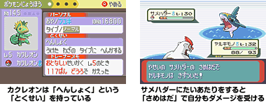 不需玩家的指示即可發揮(有其優點,當然也有其缺點@@)比方上圖中的變隱龍的特性「變色」(へんしょく)就可以讓它在遭受敵方攻擊時變成跟攻擊它的招式屬性相同
