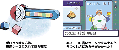 ●為了讓參加華麗大賽用的寶可夢有強大的「後天麗質」,我們必須利用樹果來製作「能量方塊」(ポロック)來提升麗質,不同顏色的能量方塊加的數值與項目有所不同,