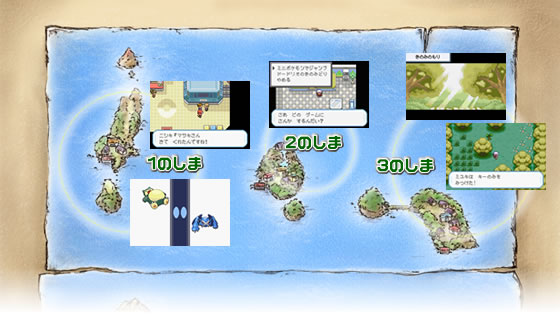 1島(1のしま):在此可捕捉傳說寶可夢火焰鳥,也有溫泉名勝,此外1島還是建立與寶石版連結能力的重鎮。