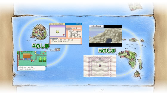 除了上述的 1~7 島外,尚有兩個小島「へそのいわ」和「たんじょうのしま」,分別要兩種特殊道具「しんぴのチケット」和「オーロラチケット」才能前往。