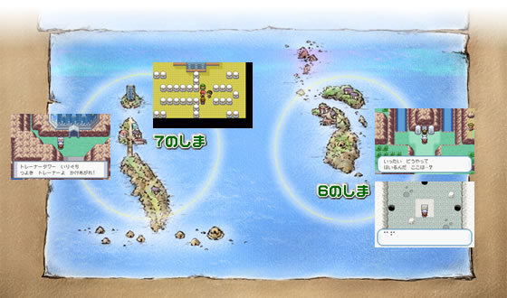 7島(7のしま):這個島有訓練家之塔,塔中的訓練家可用 「e+卡」變化;另外島的最下方還有未知圖騰供玩家蒐集,和「金 / 銀」不同的是,這次的未知圖騰多了問號和驚嘆號,共28種,算是給老玩家的一點驚喜吧!