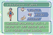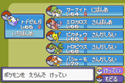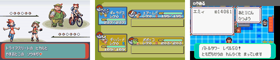 最後,介紹我最後一個奪金的戰鬥塔「バトルタワー」,這裡的對戰規則就跟以前紅/藍寶石的完全相同,不過多出了另外三種形式的對戰可供選擇。以下對四種對戰方式做簡要的介紹: 「シングルバトル」:派出手上三隻寶可夢跟電腦訓練家作1 vs. 1的對戰,BP得點最少。 「ダブルバトル」:派出手上四隻寶可夢跟電腦訓練家作2 vs. 2的對戰,BP得點稍多。 「マルチバトル」:到樓上的對戰沙龍「バトルサロン 」尋找值得信賴的夥伴(還可以找到自己收的徒弟XD),然後合作跟電腦訓練家作2 vs. 2的對戰,BP得點稍多。 「つうしんマルチバトル」:跟另一位玩家用無線傳接器連線合作跟電腦訓練家作2 vs. 2的對戰,BP得點稍多,但過程較耗時。 ▲ |