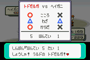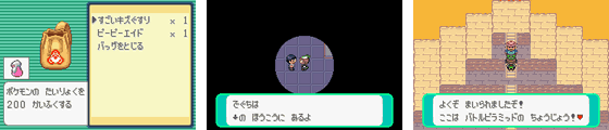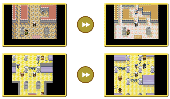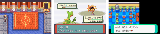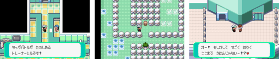 ●此外,各個道館的內部擺置也會改變,有的道館甚至全部換新,那要如何通過障礙和打敗所有訓練家就不能光抄襲紅藍寶石的攻略了。而在最後一個道館,換成了原館主的師父擔任,而原館主居然當成了最強的戰鬥冠軍!