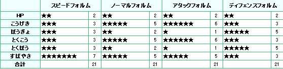 由左到右分別是速度型態、普通型態、攻擊型態、防禦型態。