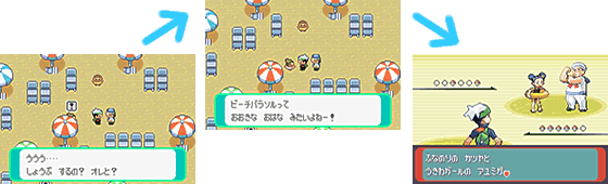 對戰競技場「バトルアリーナ」,建築外觀跟道場相仿,跟其他一進去就是打七人的設施有一點很不同的是--只有單打對戰(很難想像這地方要是有雙打對戰會變成什麼樣子XD)。本設施的戰鬥期間不容玩家自己決定更換是否寶可夢,第一隻寶可夢敗戰之後強制由之前進去時玩家決定的第二隻上場接替,亦即若寶可夢未被打敗,就不得更換。這裡最大的特點是每次戰鬥都只能在三回合中分出勝負,如果三回合內勝負不分,即以「心」「技」「體」等戰術標準進行評分,分數高者就能繼續待在場上,至於分數低者就下台去領便當了(爆) 有時會有平手狀態出現,這種時候就是兩方一起下台,如果都剩最後一隻的話就判定為電腦勝利。所以原則上這裡要盡量速戰速決,以免在三回合內發生一些變數時想逆轉都來不及。 ▲ |