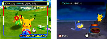 隨著時間的經過,皮卡丘對電視外面的世界也越來越有興趣,這時你就可以帶牠出外踏青(有玩過N64的前作「皮卡丘你好嗎」應該對這部份很熟悉了)。 草原、森林、海邊、雪山…在不同的環境下可以做各種有趣的活動,如玩球、種花、釣魚等。還能遇到各種不同的野生寶可夢(含一些超世代的新寶可夢們共100多隻)。 日夜與天氣的變化也會影響寶可夢們的出現率。某些節目如果從來不外出的話就看不到囉! | ![]() |