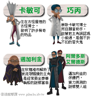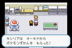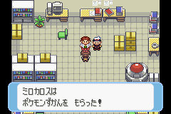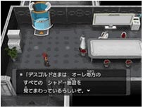 *幕後黑手「死神黃金」- 德斯哥多! 在冒險途中,主角會聽到有關德斯哥多(亦即「死神黃金」)的傳言 傳言中他就是興起這一連串黑暗神奇寶貝事件的組織總司令。 聽說他相當有錢,到底他謎樣的真面目是…? 右圖中研究員告訴主角,有關這位謎樣頭目在歐雷地區控管所有黑暗動態的事情。 |