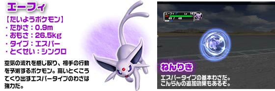 跟隨你這主角的這隻得力又可愛的神奇寶貝,正是伊布!一開始牠會的招式是「衝擊」和「咬咬」。 隨著經驗值與親密度的增長,你還可以決定一個最佳時機,讓牠進化成合乎你喜好的新神奇寶貝! | ![]() |