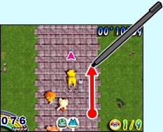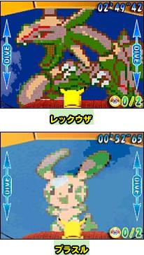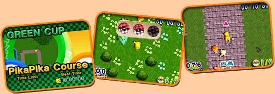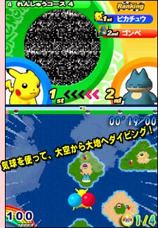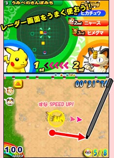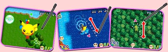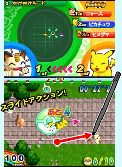 ●「寶可夢衝刺賽」是以NDS特有的觸控筆與觸控螢幕操作皮卡丘(不過如果有到日本進行過相關下載的話,對戰模式還有小卡比獸可選), 進而奪取冠軍的動作競賽遊戲(為了有別於靜態的競賽遊戲,故以此名稱區別之)。透過觸控筆的滑動(日文寫做「スライドアクション」,是NDS的招牌玩法,可是對螢幕的傷害相當大, 更慘的是連用保護貼也感覺沒很大的作用@@),讓我們得以展現高超的技巧擊敗電腦對手(同時也使用「高超」的技術在螢幕上製造大量刮痕 Orz), 得到冠軍的殊榮(如果每一場都得到第一名,可以得到亮晶晶的獎盃,可是若只有總積分第一名,就只有一般的獎盃而已,想必有去做進階挑戰的玩家們應該都有深刻體會才是呀~囧)