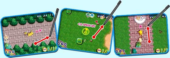 ●競賽的畫面在NDS的下畫面(因為只有下畫面才能觸控–﹏–),上畫面則是為雷達畫面(但是在飛行狀態中雷達是沒有功效的,因此在升空前請先注意下一個目標的確切位置), 善用雷達畫面可以讓我們免於跑錯檢查點的窘境(想當初剛開始玩DASH的時候,還常常先越過前好幾個檢查點跑到後面的檢查點 |||)。 善用不同的適性變化,也就是在地圖上會看到的一些不同顏色的方塊(雷達上也看的到),比方上圖中的淺綠色方塊是可以在草地上還能維持速度100的適性變化方塊, 下圖左中的淺黃色方塊則是可以在沙地上還能維持速度100的適性變化方塊。當然有些地形不是只用適性變化方塊就能搞定的(如海洋),此時就要以其他交通工具(如氣球跟乘龍)渡過之。