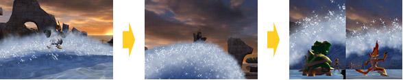 ▲なみのり這個老招式現在變的更加壯觀,讓玩家感覺自己也要被沖走了,分割畫面攻擊的效果更是前所未見