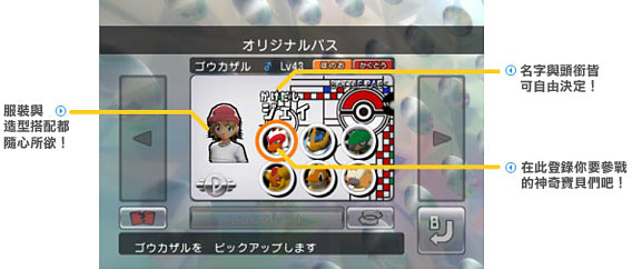 ●一開始決定造型設計,並且設定名字,便可以得到「オリジナルパス(Original Pass,即該造型專屬的バトルパス)」,然後再把上述寶可夢複製動作完成,就可以達成對戰的完好準備。